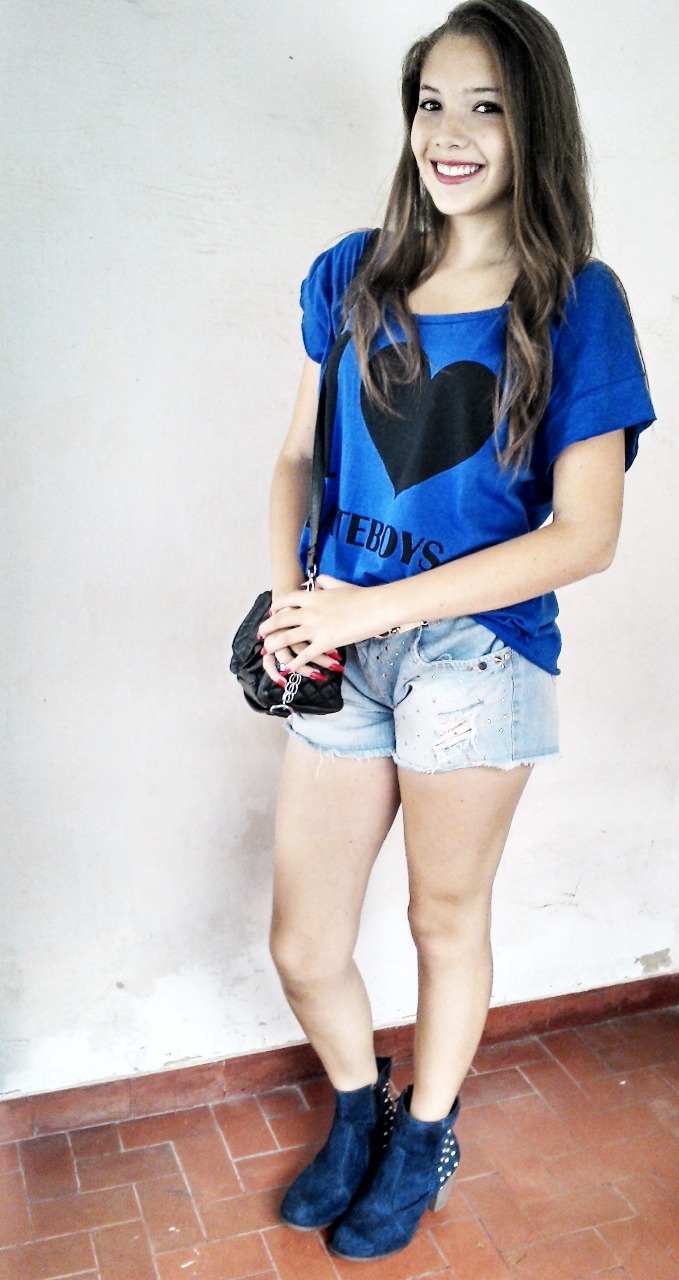 Meu estilo é diferenciado. Tem dias que gosto de ser mais menininha, tem dias que gosto de me vestir como mulher e tem dias que gosto de me vestir à vontade. Um dos meus looks que separei é esse. É um look despojado e que eu amo. Blusinha básica Azul que é uma cor que se destaca em mim que sou branquinha, um short rasgadinho e uma botinha azul. Tudo super combina e é um look super usado por adolescentes.